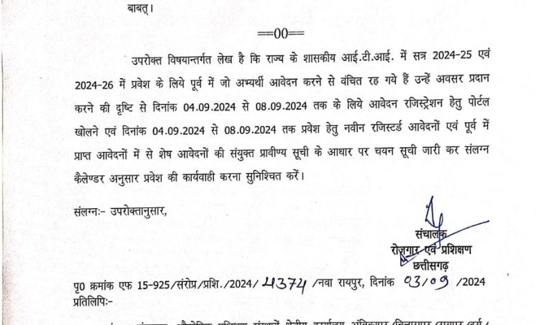 सारंगढ़ बिलाईगढ़, 3 सितम्बर 2024/ राज्य के सभी शासकीय आईटीआई में शैक्षणिक सत्र 2024-25 एवं 2024-26 में प्रवेश के लिए पूर्व में जो अभ्यर्थी आवेदन करने से वंचित रह गए हैं, उन्हें अवसर प्रदान किया गया है। अभ्यर्थी अब 4 सितंबर 2024 से 8 सितंबर 2024 तक अपना आवेदन पोर्टल में रजिस्ट्रेशन कर सकते हैं। ऑनलाइन आवेदन पत्र रजिस्ट्रेशन हेतु पोर्टल सीजीआईटीआई डॉट सीजीस्टेट डॉट जीओवी डॉट इन cgiti.cgstate.gov.in है। 04 सितंबर से 8 सितंबर तक प्रवेश हेतु नवीन रजिस्टर्ड आवेदनों एवं पूर्व में प्राप्त आवेदनों में से शेष आवेदनों की संयुक्त ग्रामीण सूची के आधार पर चयन सूची जारी किया जाएगा, जिसके आधार पर आईटीआई में प्रवेश की कार्यवाही की जायेगी।