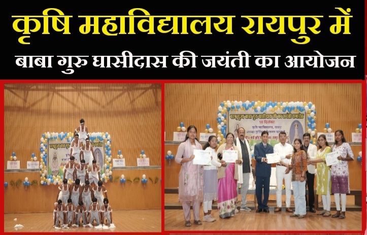 कृषि महाविद्यालय में समस्त छात्र-छात्राओं के संयुक्त प्रयास से परम पूज्य बाबा गुरु घासीदास जी की 269वीं जयंती का भव्य, गरिमामय एवं प्रेरणादायी आयोजन किया गया। कार्यक्रम में शिक्षा, प्रशासन एवं सामाजिक क्षेत्र से जुड़े अनेक गणमान्य अतिथियों की गरिमामयी उपस्थिति रही। आयोजन का उद्देश्य बाबा गुरु घासीदास जी के सत्य, समानता एवं मानवता के संदेश को युवा पीढ़ी तक पहुँचाना रहा। कार्यक्रम के मुख्य अतिथि श्री एस. एल. मात्रे (सेवानिवृत्त न्यायाधीश, औद्योगिक न्यायालय, बिलासपुर) ने अपने उद्बोधन की शुरुआत बाबा गुरु घासीदास जी के सतवचनों से की। उन्होंने कहा कि बाबा जी ने समाज में व्याप्त कुरीतियों को जड़ से समाप्त कर मानव समाज को सत्य का मार्ग दिखाया। उन्होंने स्पष्ट किया कि सतनाम किसी एक जाति विशेष तक सीमित नहीं है, बल्कि इसे मानने वाले सभी समाज के लोग बाबा गुरु घासीदास जी को अपना आदर्श मानते हैं। विशिष्ट अतिथि श्री ए. के. बंजारा (एमडी, सीड सर्टिफिकेशन, रायपुर) ने अपने उद्बोधन में कहा कि आज समाज जिस सकारात्मक दिशा में आगे बढ़ रहा है, वह बाबा गुरु घासीदास जी द्वारा बताए गए सत्य के मार्ग का परिणाम है। उन्होंने “मानव-मानव एक समान” के संदेश पर प्रकाश डालते हुए कहा कि बाबा जी ने पूरे समाज को एक सूत्र में बांधने का कार्य किया। विद्यार्थियों को संबोधित करते हुए उन्होंने शिक्षा पर विशेष ध्यान देने तथा शासन द्वारा संचालित विभिन्न राष्ट्रीय फेलोशिप एवं छात्रवृत्ति योजनाओं का लाभ उठाने की अपील की। डॉ. वी. के. त्रिपाठी (डीआरएस, इंदिरा गांधी कृषि विश्वविद्यालय, रायपुर) ने अपने उद्बोधन में कहा कि बाबा गुरु घासीदास जी केवल एक संत ही नहीं, बल्कि महान समाज सुधारक और दूरदर्शी विचारक थे। उन्होंने सत्य, अहिंसा और समानता को अपने जीवन का आधार बनाकर समाज को नई दिशा दी तथा मानवता, सद्भाव और समरसता का संदेश दिया। बाबा जी के विचार आज भी समाज के प्रत्येक वर्ग के लिए मार्गदर्शक हैं। वहीं डॉ. संजय शर्मा (अधिष्ठाता, छात्र कल्याण) ने विद्यार्थियों को सामाजिक मूल्यों के साथ आगे बढ़ने का संदेश दिया। कार्यक्रम की अध्यक्षता कर रहीं डॉ. आरती गुहे (अधिष्ठाता, कृषि महाविद्यालय, रायपुर) ने अपने अध्यक्षीय उद्बोधन में कहा कि बाबा गुरु घासीदास जी के आदर्श सामाजिक समरसता और नैतिक चेतना के प्रतीक हैं। उन्होंने युवाओं से शिक्षा के साथ मानवीय मूल्यों को अपनाकर समाज एवं राष्ट्र निर्माण में सकारात्मक भूमिका निभाने का आह्वान किया। इस जयंती के अवसर पर प्रतिवर्ष की भांति इस वर्ष भी महाविद्यालय में निबंध लेखन, रंगोली, पोस्टर निर्माण एवं प्रश्नोत्तरी जैसी विभिन्न प्रतियोगिताओं का आयोजन किया गया, जिसमें कुल 110 विद्यार्थियों ने उत
