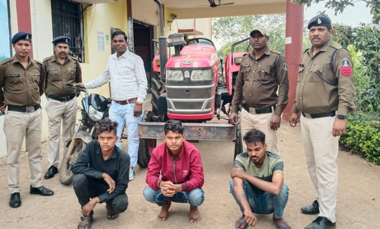 प्रार्थी तिलक साहू पिता रामगोपाल साहू उम्र 22 वर्ष साकिन पेण्ड्रावन थाना सरसीवां जिला सांरगढ बिलाईगढ छ0ग0 के द्वारा दिनांक 13.02.24 को थाना उपस्थित आकर एक लिखित आवेदन प्रस्तुत कर रिपोर्ट दर्ज कराया कि 29.01.24 को पिथौरा जांनडियर शोरूम से एक लाल रंग का महेन्द्रा ट्रैक्टर क्रं0 सीजी 04 एमयू 4891 खरीदकर अपने घर के सामने खडी किया था जिसे अज्ञात चोर द्वारा चोरी कर ले गया है रिपोर्ट अपराध पंजीबद्ध कर विवेचना में लिया गया एवं वरिष्ठ अधिकारियो को सूचना देकर लगातार पतासाजी किया जा रहा था । वरिष्ठ अधिकारी श्रीमान पुलिस अधीक्षक महोदय, अतिरिक्त पुलिस अधीक्षक महोदय श्रीमती निवेदिता पाल एवं डीएसपी हेड क्वार्टर मनीष कुंवर के मार्गदर्शन पर सीसीटीव्ही फुटेजो को चेकिंग किया जा रहा था कि पता चला कि ग्राम सरधारभांठा से मधाईभांठा होते हुए मेन रोड से छिंद पेट्रोल पंप की सीसीटीव्ही फुटेज में दिखा आगे ग्राम चंदाई में सीसीटीव्ही फुटेज चेक करने पर नही दिखने पर ग्राम कुधरी में प्रतीत हुआ तब ग्राम कुधरी की सीसीटीव्ही फुटेज किया गया कुधरी की फुटेज में दिखा आगे कही नही दिखने पर ग्राम कुधरी में पतासाजी किया जा रहा था तभी मुखबीर से सूचना मिला कि एक ब्यक्ति लाल रंग की महेन्राम ट्रैक्टर लेकर जा रहा है तब मौका स्थल पहुंचकर घेराबंदी कर रेड कार्यवाही किया गया तब चालक द्वारा रात्रि एवं अंधेरा होने से अंधेरा का फायदा उठाकर भाग रहा था जिसे मौके पर हमराह स्टाफ के मौके पर गिरफ्तार किया गया तथा मुताबिक जप्ती पत्रक के समक्ष गवाहन आरोपीगणो के मेमोरण्डम पर चोरी गये ट्रैक्टर तथा घटना में प्रयुक्त एक मोटर सायकल सीडी डिलक्स क्रं0 सीजी 11 बीएच 9137 एवं तीन नग एनरोइड मोबाईल कुल किमती- 100000 एक लाख रूपये जप्त किया गया है। आरोपीगण को गिरुफ्तार कर गिरुफ्तारी की सूचना आरोपीगणो के परिजन को दिया जाकर न्यायिक अभिरक्षा में जेल भेजा गया है।