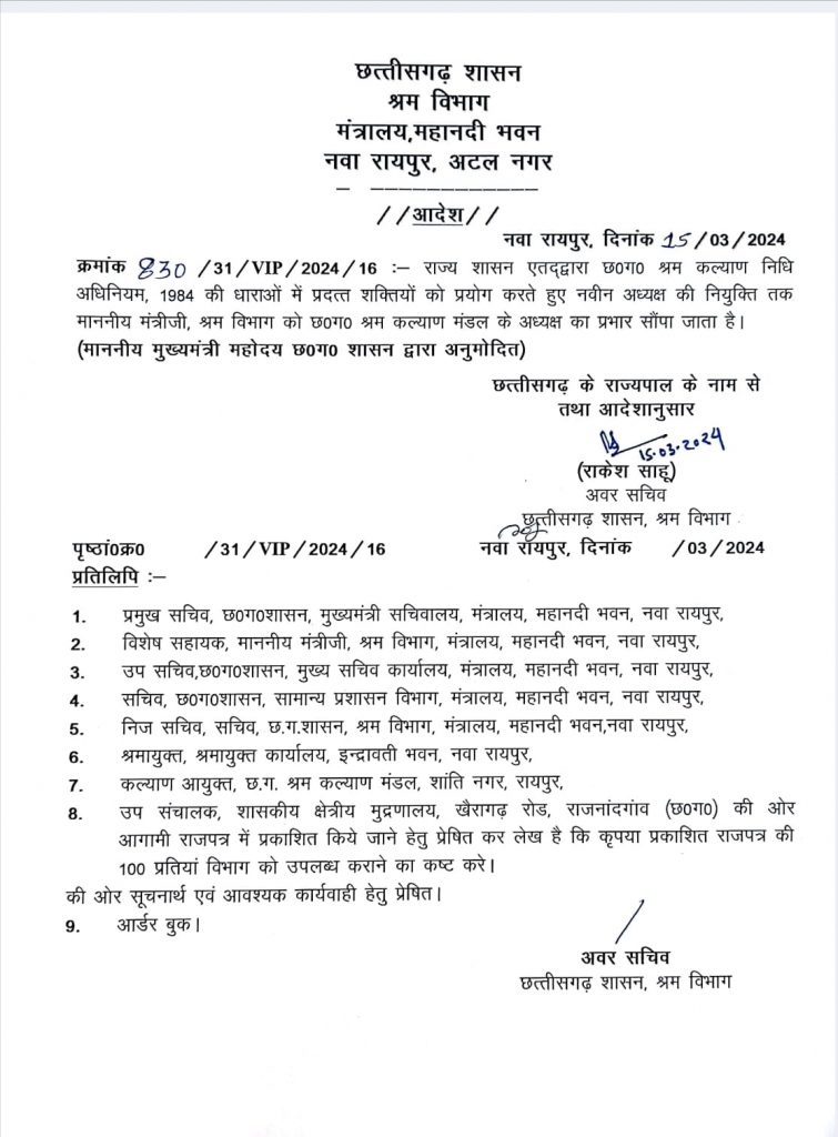 श्रम मंत्री लखनलाल देवांगन को आगामी आदेश पर्यन्त श्रम कल्याण मंडल के अध्यक्ष का प्रभार सौंपा गया