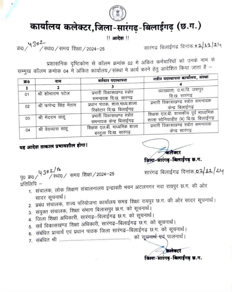छत्तीसगढ़ शासन में कैबिनेट मंत्री एवं सारंगढ़ बिलाईगढ़ जिले के प्रभारी मंत्री टंकराम वर्मा के अनुमोदन के पालनार्थ कार्यालय कलेक्टर सारंगढ़ बिलाईगढ़ के द्वारा जारी नवीन पदस्थापना आदेश में शिक्षा विभाग ने किए गए फेरबदल में विकासखंड स्त्रोत समन्वयक सारंगढ़ (बीआरसी) के पद पर वेदव्यास साहू का नियुक्ति किया गया है।