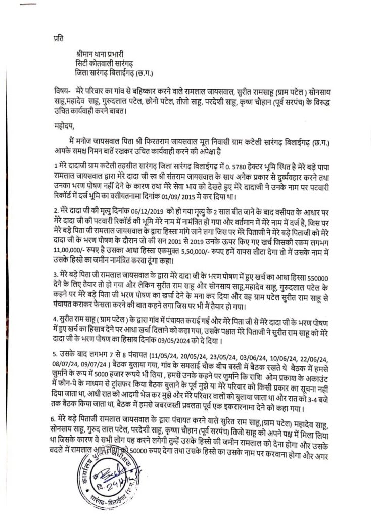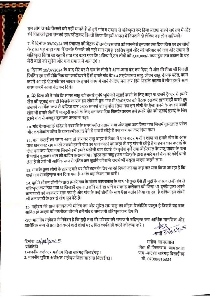 सारंगढ़ – समाज के लोगो ने अपने ही समाज के ग्रामीण को किया सामाजिक बहिष्कार और किसी ने साथ दिया तो उसे भी जुर्माना लगाया गया आज भी समाज में सामाजिक बहिष्कार की प्रथा चल रही है ऐसे ही एक मामला सारंगढ़ बिलाईगढ़ जिले के मुख्यालय से महज 5 से 7 किलो मीटर दूर गांव कटेली है जहा एक जायसवाल परिवार को सामाजिक रूप से बहिष्कृत कर दिया है दरसल मामला जमीन विवाद को लेकर है और विवाद ऐसा की एक परिवार ने अपने ही परिवार वंशज को सामाजिक रूप से बहिष्कृत कर दिया पीड़ित ने सारंगढ़ पुलिस अधीक्षक से गुहार लगाई है मिली जानकारी अनुसार मनोज जायसवाल पिता फिरत राम जायसवाल को उनके दादा जी स्वर्गीय संतराम जायसवाल को उनके बेटे रामलाल जायसवाल ने अनेक प्रकार से दुर्व्यवहार किया और उनका बुढ़ापे में भरण पोषण तक नही किया तो उनके पोते मनोज ने सेवा भाव से उनकी सेवा की थी उसी सेवा भाव और दादा जी के प्रति लगाव से उनके दादा जी संतराम ने 0.5780 हेक्टेयर भूमि अपने पोते के नाम किया था और उनके देहांत के बाद उसे अब लेने के लिए उनके ही बड़े पापा रामलाल जायसवाल अनेक प्रकार से यातनाएं के साथ प्रताड़ित करने लगे और हिस्सा मागने लगे दोनो परिवार के बीच आपसी समझौता में दादा के ऊपर लगभग 11 लाख रूपये किए खर्च का आधा पैसा 550000 रूपये देने पर जमीन का भी बटवारा आधा करने को लेकर सुलह हुआ था लेकीन गांव के ही सूरित राम साहू, सोनसाय साहू, महादेव साहू, गुरुदलाल पटेल के बहकावे में आकर खर्चा देने से इंकार कर दिया फिर सुलह करने ग्राम पंचायत की बैठक हुई और लगातार 7 से 8 बार पंचायत बैठक बुलाया गया बकायदा बैठक कर पीड़ित से 5 हजार जुर्बाना भी लिया गया और जमीन का बटवारा देने के लिए दबाव बनाया गया और कहा की आधा हिस्सा जमीन रामलाल जायसवाल के नाम कर दो और 50 हजार ले लो लेकीन जब पीड़ित ने बात नही मानी तो अंतिम बैठक कर मनोज जायसवाल और उनके परिवार को समाजिक रूप से बहिष्कृत कर दिया गया और यह भी तय कर दिया गया की समाज में फिर से शामिल होना है तो 2 लाख रूपये जुर्माना देने होंगे तभी उन्हें फिर से शामिल किया जाएगा उसके बाद लोगो ने उनके घर आना जाना बंद कर दिया गया एक बार एक ट्रैक्टर मालिक सागर साहू ने उनका खेत जोताई किया तो उसे भी 2500 रूपये जुर्माना लगाया गया यहां तक कि गांव में नवरात्रि पूजा हुई तो उन्हे समाज से बहिष्कृत है कहके प्रसाद देने से भी इंकार कर दिया इतना ही नही समाजिक बहिष्कार कर इस हद तक प्रताडित किया गया की उनके बहन के लिए आने वाले रिश्ते तक को मना किया गया बताया जाता है की पूर्व में भी इसी तरह कई परिवार को समाजिक बहिष्कार किया जा चुका है और अंत में जब पीड़ित मनोज जायसवाल थक गया तो उन्होंने सारंगढ़ बिलाईगढ जिले की पुलिस अधीक्षक ( एसपी) कार्यालय में लिखित शिकायत दर्ज कराई है अब द