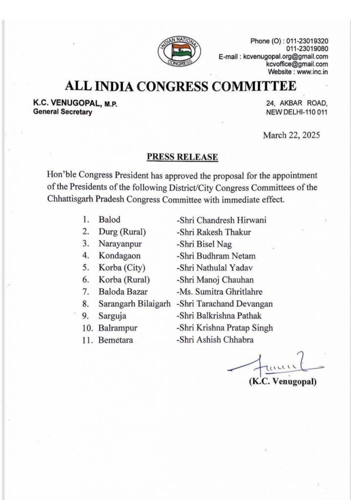 सारंगढ़ बिलाईगढ़ – कांग्रेस पार्टी ने सुचना जारी करते हुए छत्तीसगढ के कई जिलों के जिला अध्यक्ष बदले गए जिसमें सारंगढ़ बिलाईगढ़ जिला अध्यक्ष अरूण मालाकार को भी बदला गया और ताराचंद देवांगन को सारंगढ़ बिलाईगढ़ जिलाध्यक्ष बनाया गया हैँ देखे सूची