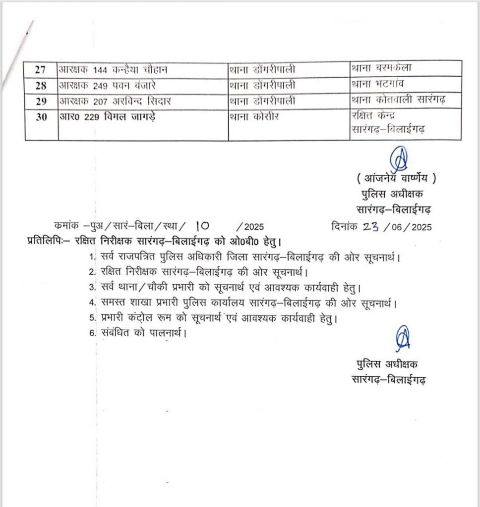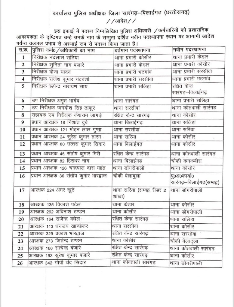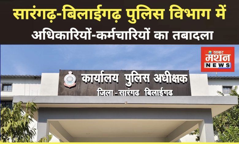 BREAKING NEWS: सारंगढ़-बिलाईगढ़ पुलिस विभाग में 30 अधिकारियों- कर्मचारियों का तबादला