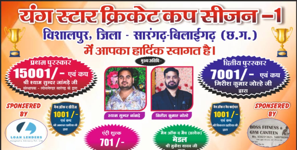 यंग स्टार क्रिकेट कप सीजन 1 प्रतियोगिता का शानदार शुभारंभ विशालपुर (सारंगढ़) में 05 जनवरी से… सिर्फ 32 टीमों को ही मिलेगा प्रवेश…