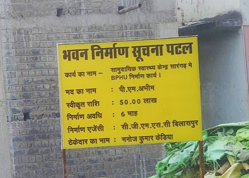 सारंगढ़ – सारंगढ़ बिलाईगढ़ जिले में सामुदायिक स्वास्थ्य केंद्र सारंगढ़ में BPHU निर्माण कार्य, पी.एस अभीम मद से भवन बन रहा है जिसका स्वीकृत राशि 50 लाख रूपये की लागत राशि है वहीं कार्य एजेंसी सी.जी.एम.एस.सी. बिलासपुर और ठेकेदार मनोज कुमार केडिया (सारंगढ़ वाले) है वहीं इस भवन निर्माण में कई अनियमितताँए देखने को मिल जाएंगे।
