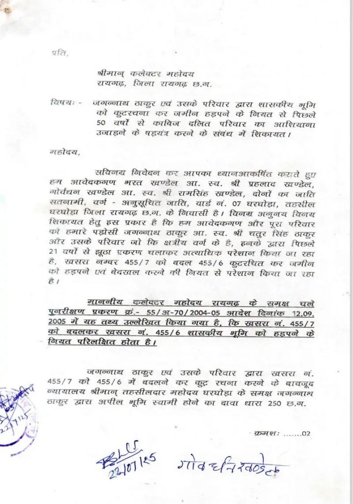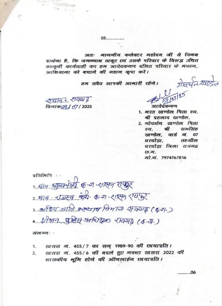 वार्ड क्रमांक 07 निवासी एक दलित परिवार ने गंभीर आरोप लगाते हुए कहा है कि उनके पड़ोसी जगन्नाथ ठाकुर और उसके परिवार द्वारा कूटरचित दस्तावेजों के आधार पर उन्हें उनके मकान से जबरन बेदखल करने की साजिश बार बार रची जा रही है।